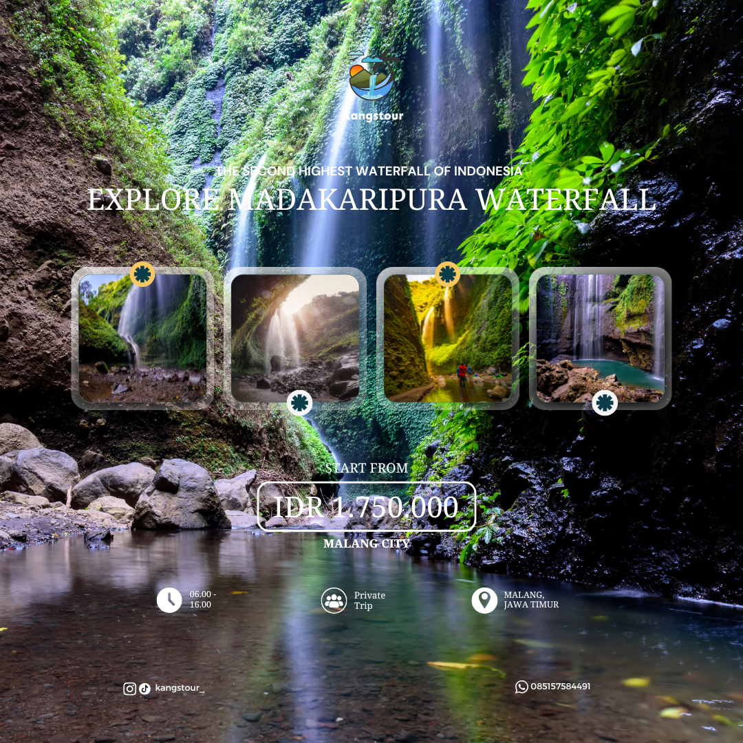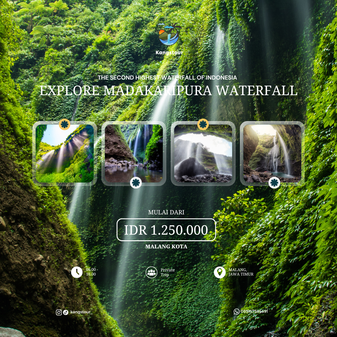 Jelajahi keindahan tersembunyi Air Terjun Madakaripura, destinasi eksotis yang dikenal sebagai tempat pertapaan Mahapatih Gadjah Mada. Air terjun ini merupakan air terjun tertinggi nomer 2 di Indonesia, memiliki ketinggian lebih dari 200 meter ini dikelilingi tebing curam dan rimbunan hijau, menciptakan suasana sejuk yang menenangkan.